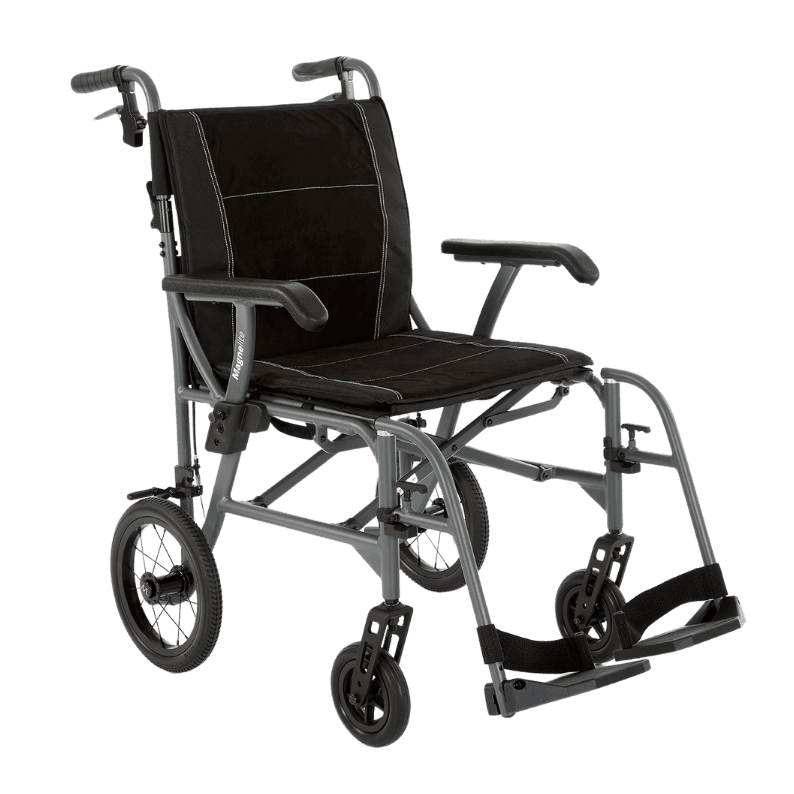 For added convenience, the Magnelite Transit Wheelchair features flip-up armrests for easy side transfers, removable footrests for customisable support, and a rear storage compartment for carrying essentials. Its lightweight design and practical features make it an ideal solution for travel, daily errands, and short-term mobility assistance.